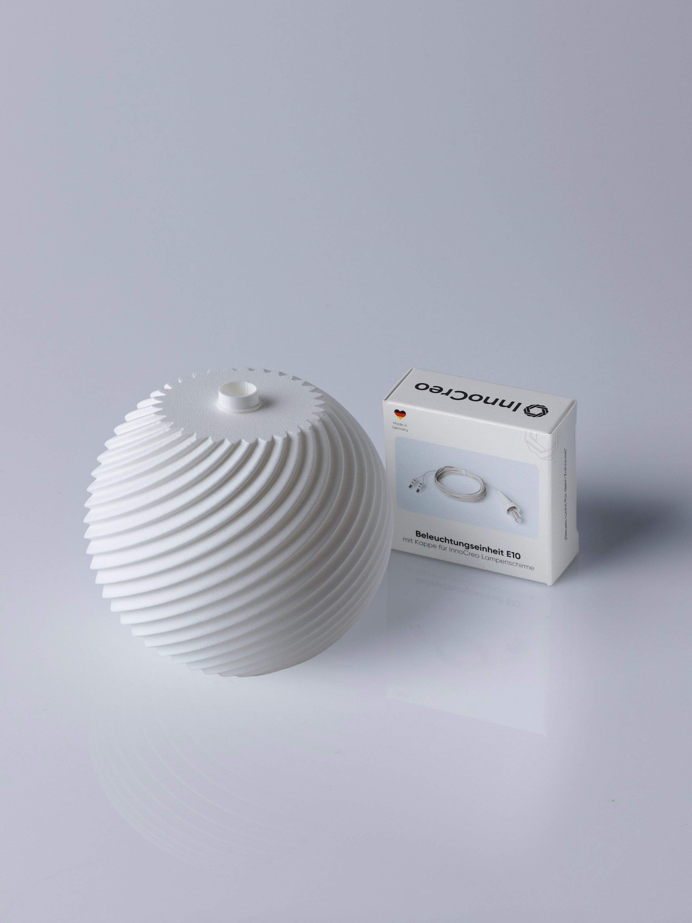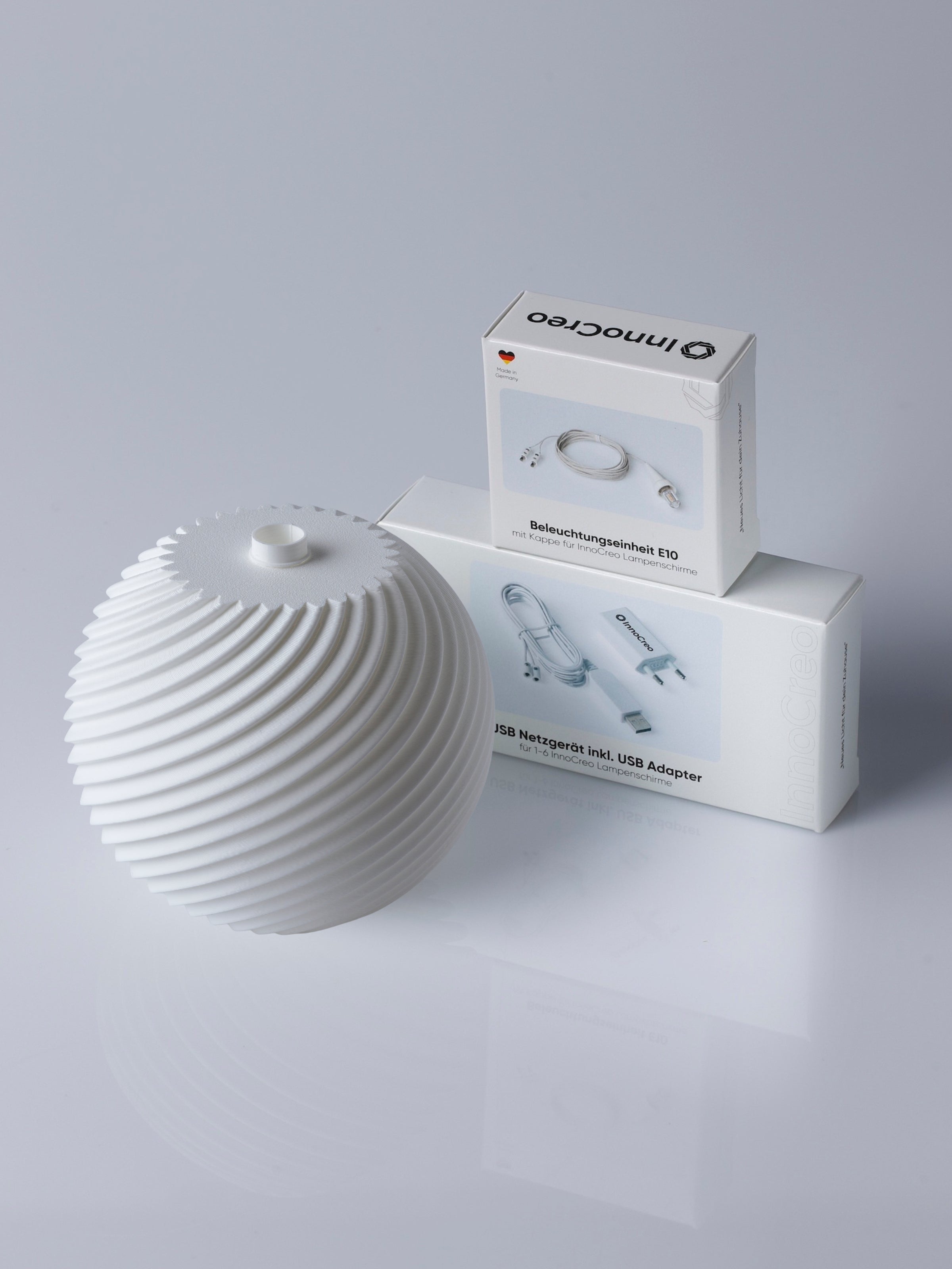 Die Montage deiner InnoCreo Lampe ist so einfach wie genial. Du benötigst nur drei Komponenten: den Lampenschirm, die Beleuchtungseinheit (mit 3 m Kabel, E10 Fassung, LED und Zwergsteckern) und das Netzteil.