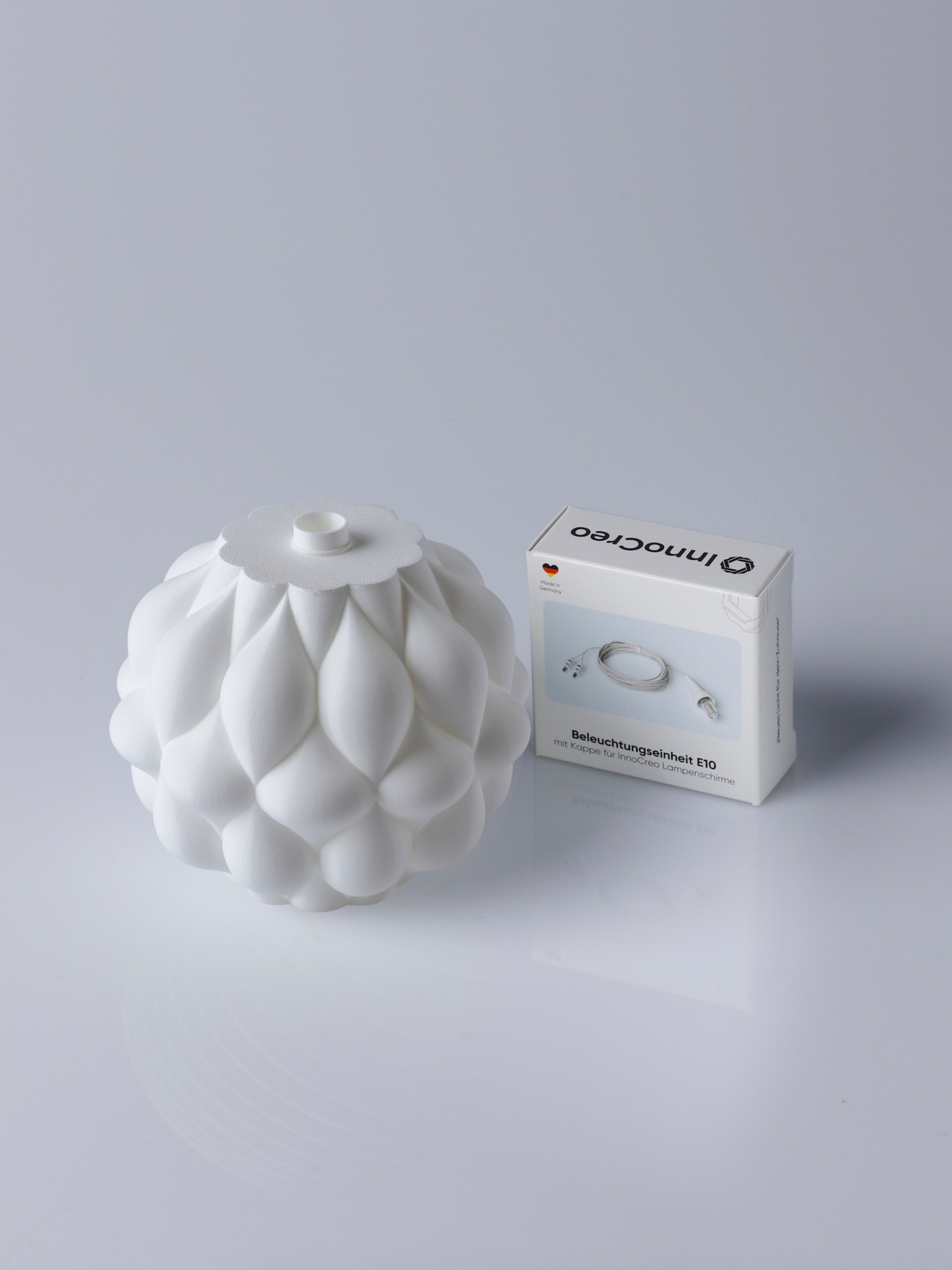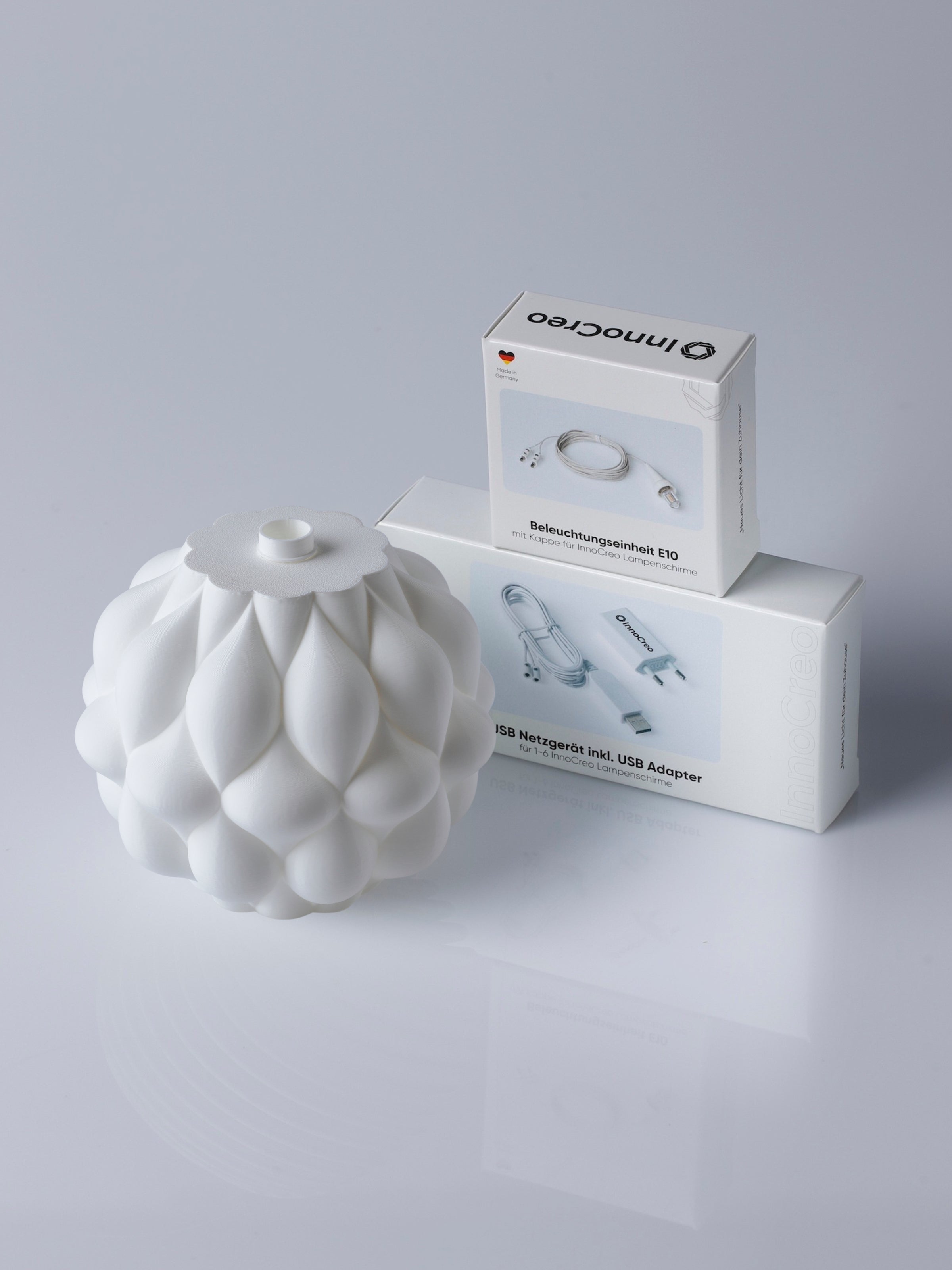 Die Montage deiner InnoCreo Lampe ist so einfach wie genial. Du benötigst nur drei Komponenten: den Lampenschirm, die Beleuchtungseinheit (mit 3 m Kabel, E10 Fassung, LED und Zwergsteckern) und das Netzteil.
