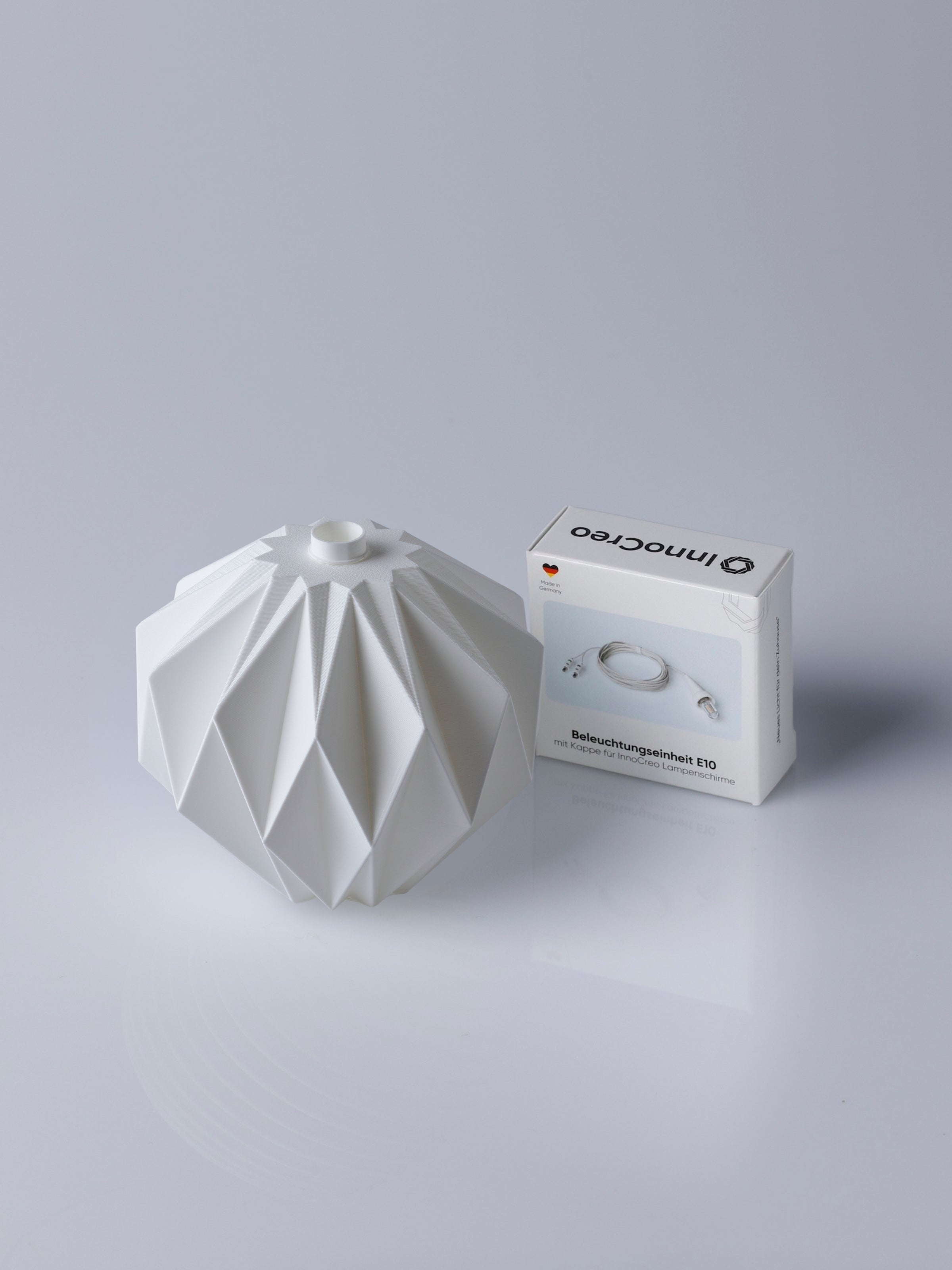 Die Montage deiner InnoCreo Lampe ist so einfach wie genial. Du benötigst nur drei Komponenten: den Lampenschirm, die Beleuchtungseinheit (mit 3 m Kabel, E10 Fassung, LED und Zwergsteckern) und das Netzteil.