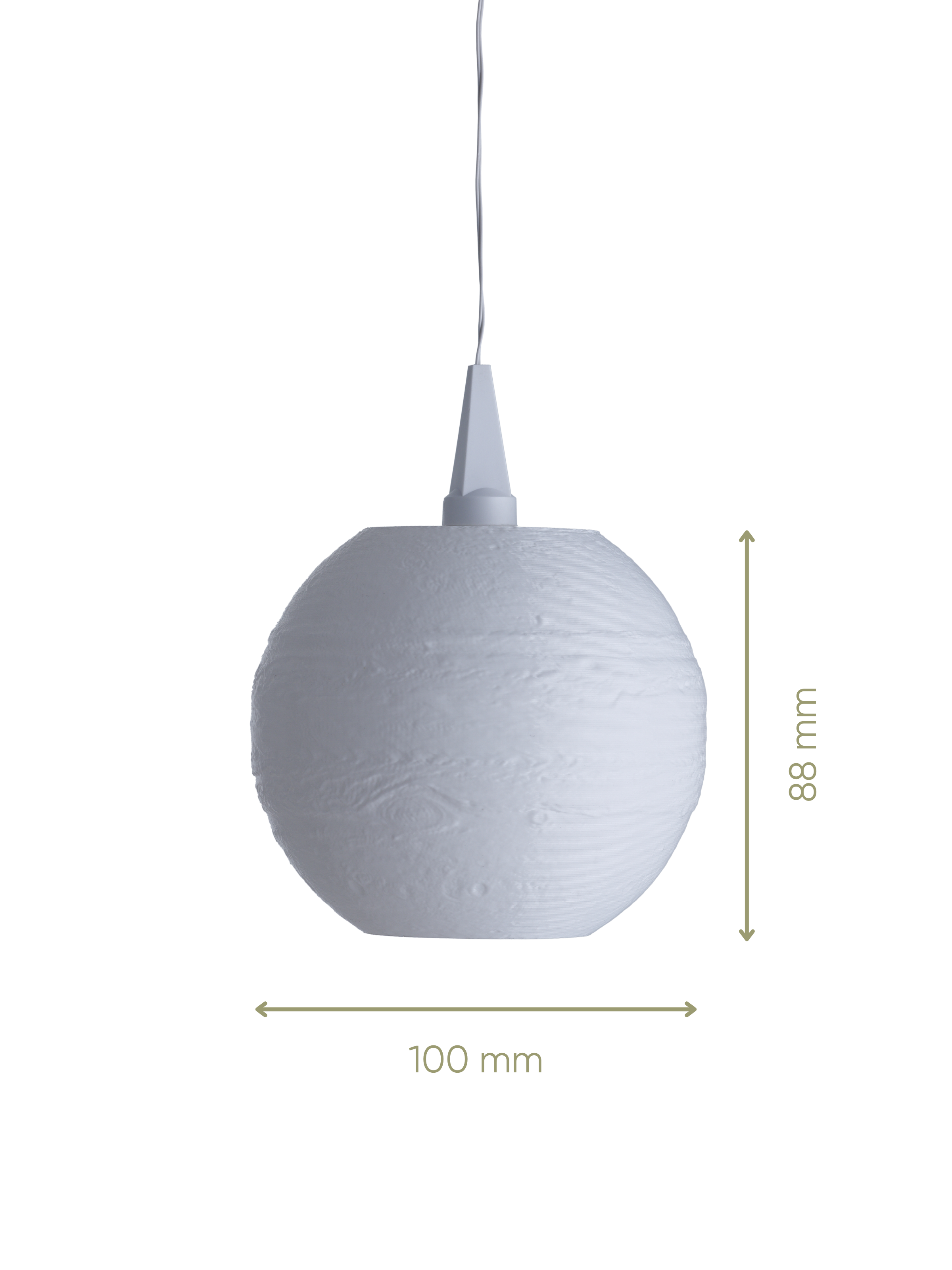 "Jupiter" zeichnet sich durch seine ikonischen Wolkenbänder und das berühmte Sturmauge, den Großen Roten Fleck, aus, die auf der Oberfläche des Lampenschirms stilisiert dargestellt sind. Die geschwungenen Linien und Strukturen auf dem weißen Material reflektieren das Licht auf eine faszinierende Weise und schaffen eine kraftvolle, atmosphärische Beleuchtung, die an den Gasriesen erinnert. "Jupiter" ist ein prächtiges Modell und lässt sich wunderbar mit anderen planetarischen Lampenschirmen kombinieren.