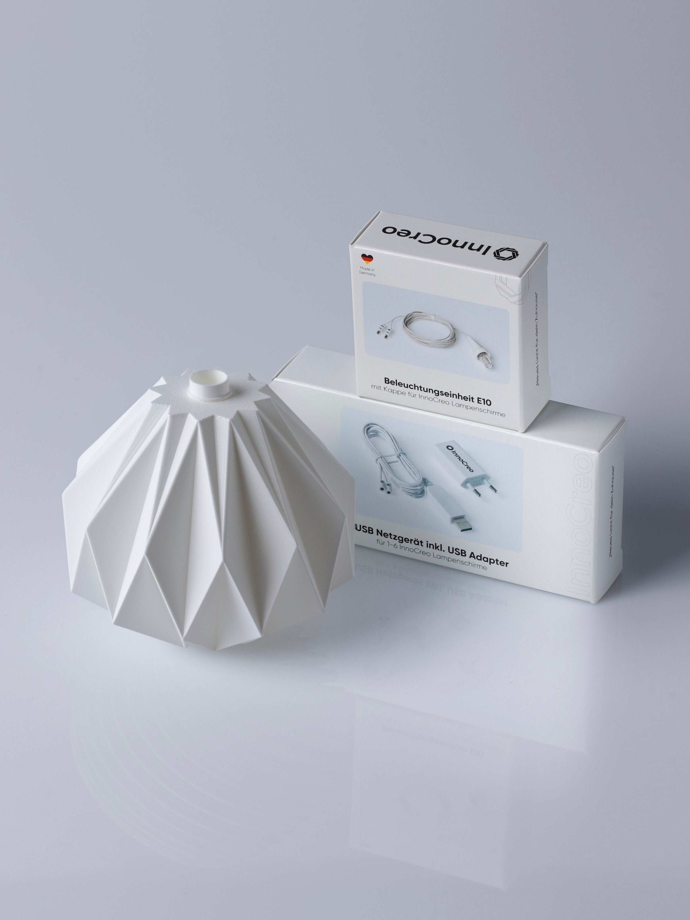 Die Montage deiner InnoCreo Lampe ist so einfach wie genial. Du benötigst nur drei Komponenten: den Lampenschirm, die Beleuchtungseinheit (mit 3 m Kabel, E10 Fassung, LED und Zwergsteckern) und das Netzteil.