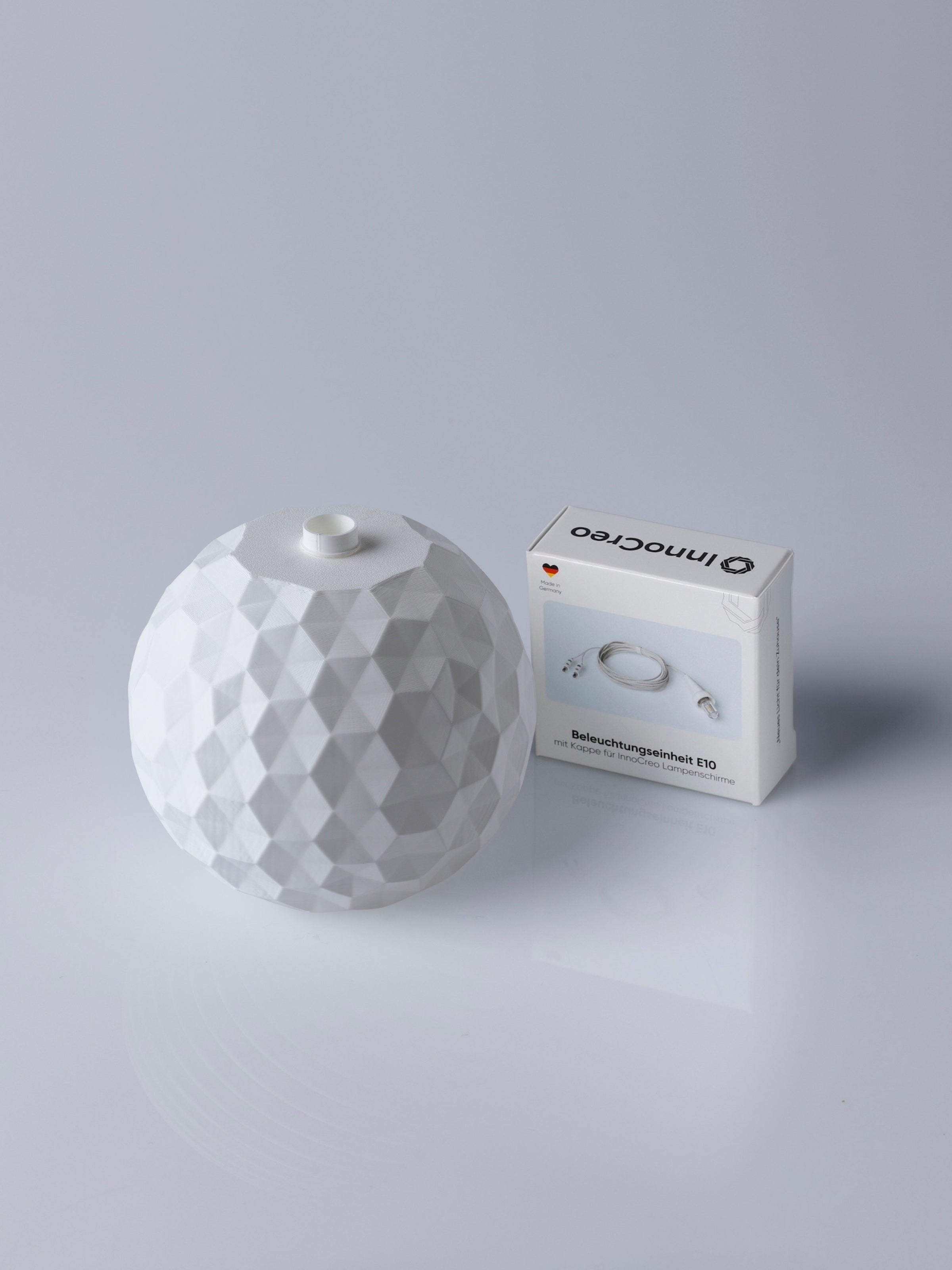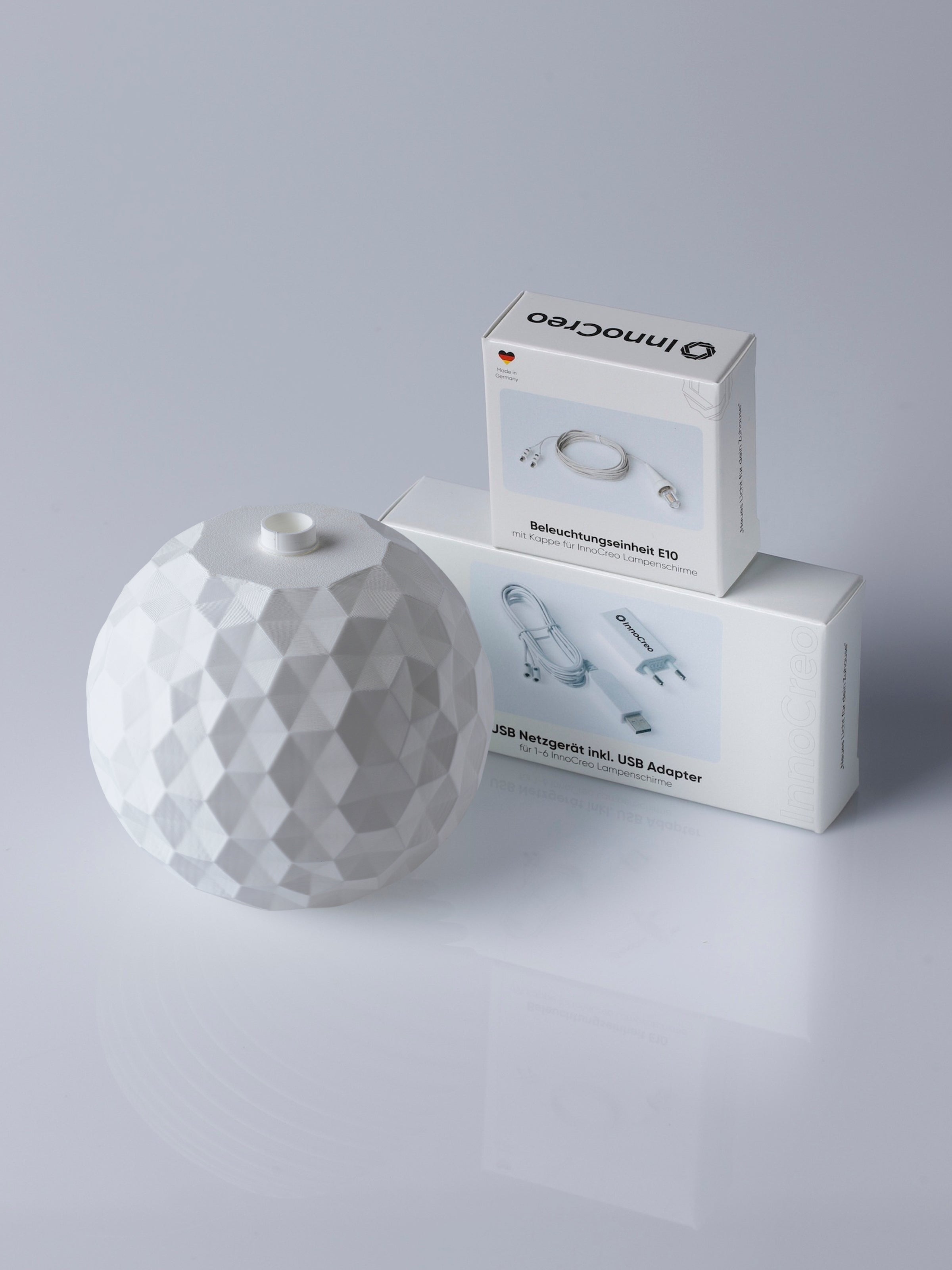 Die Montage deiner InnoCreo Lampe ist so einfach wie genial. Du benötigst nur drei Komponenten: den Lampenschirm, die Beleuchtungseinheit (mit 3 m Kabel, E10 Fassung, LED und Zwergsteckern) und das Netzteil.