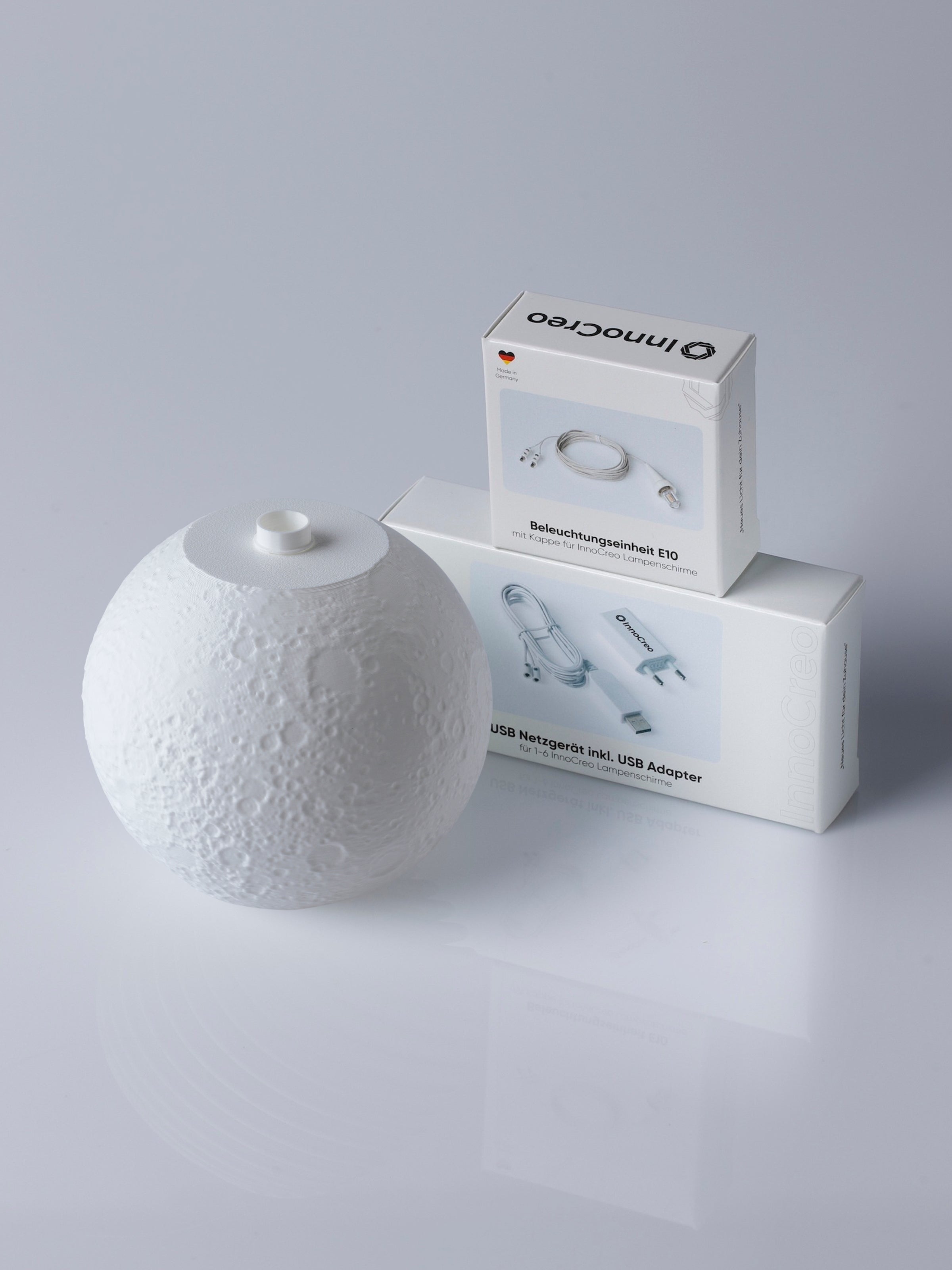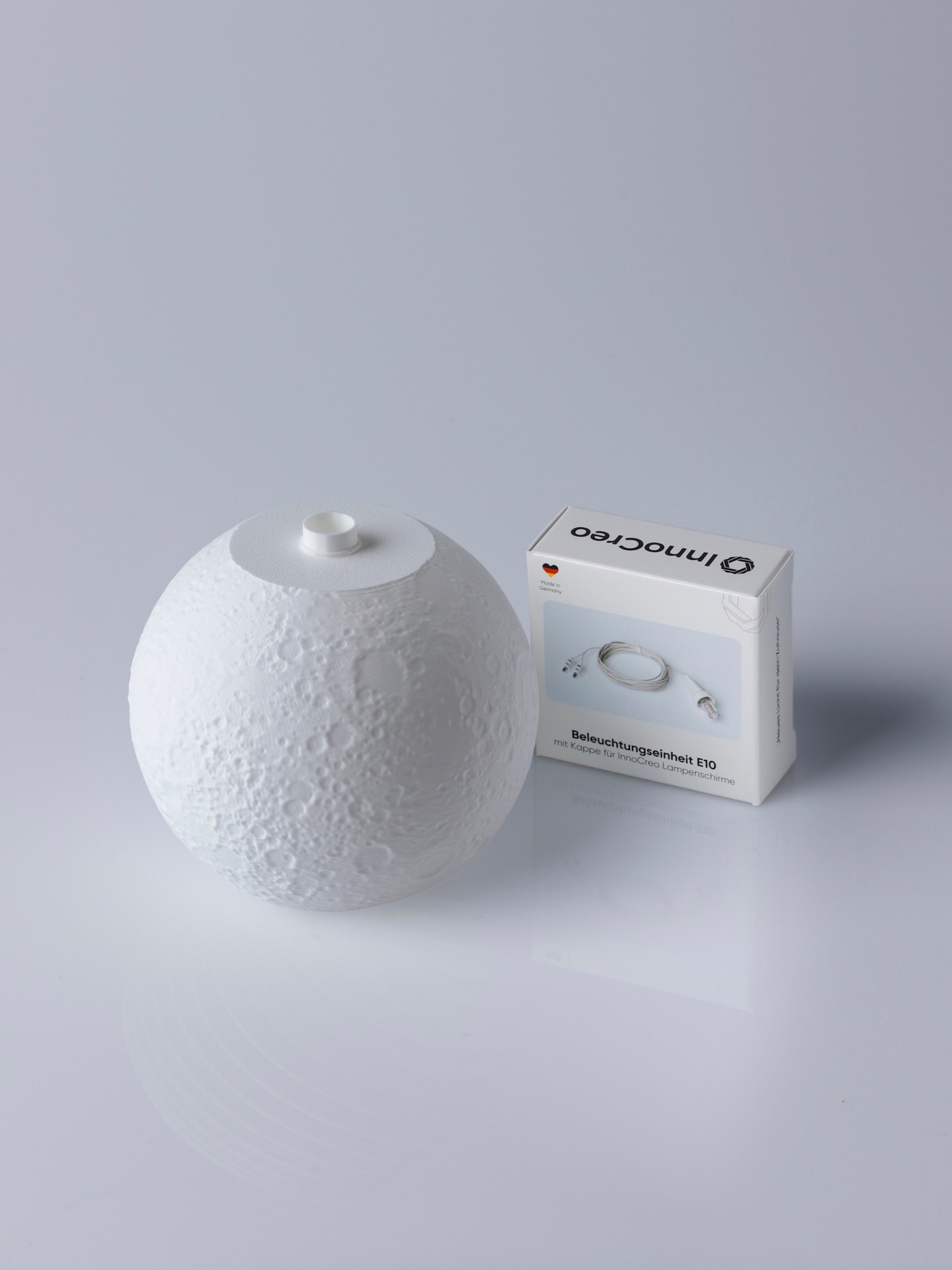 Unser "Mond" zeichnet sich durch seine detaillierte, mondähnliche Oberfläche aus, die die Krater und Unebenheiten der Mondlandschaft in stilisierter Form wiedergibt. Die strukturierten Konturen auf dem weißen Material reflektieren das Licht auf faszinierende Weise und schaffen eine atmosphärische Mond Lampe, die an das sanfte Mondlicht erinnert.